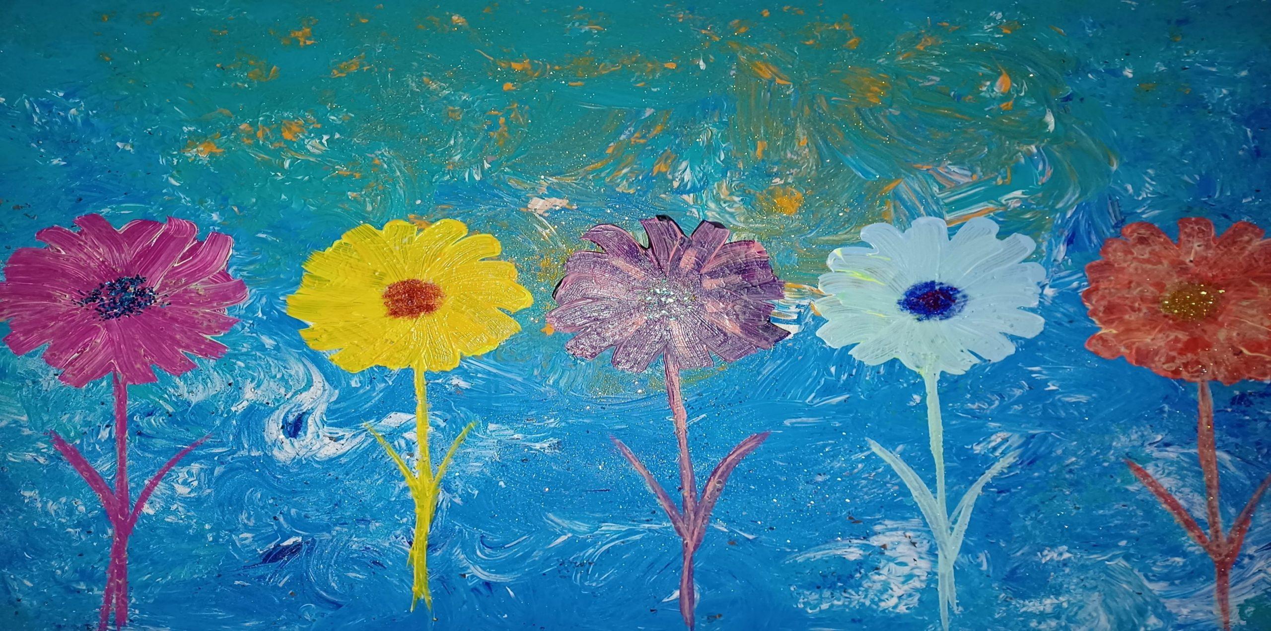 Mit einer einzigartigen Mixtur aus Acryl und Mineralien, spüre ich den Farbgebungen der Blumen, Reflexionen des Lichts nach und gebe so meinen Gemälden eine Lebendigkeit, die den Betrachter im Innersten berührt, sowie ständige Veränderung der Wahrnehmung projeziert.